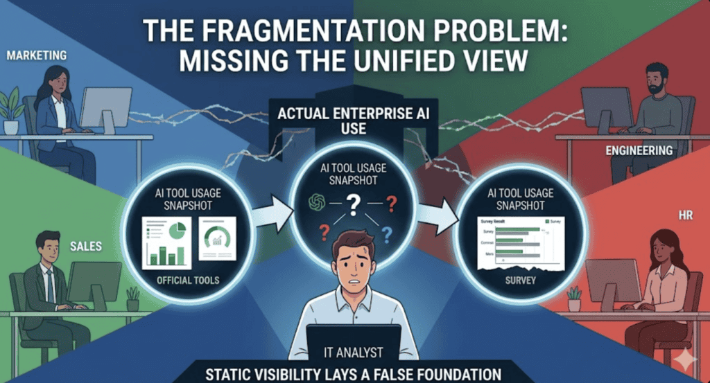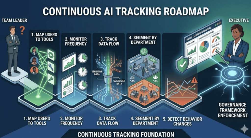 Tracking AI tool usage across employees and departments requires continuous monitoring of tools, users, and data flows. Most enterprises rely on incomplete snapshots, missing the majority of actual usage. Effective tracking combines SaaS visibility, network data, and user-level insights to maintain control over AI adoption. You can grab the Shadow AI Benchmark Report to review the details.