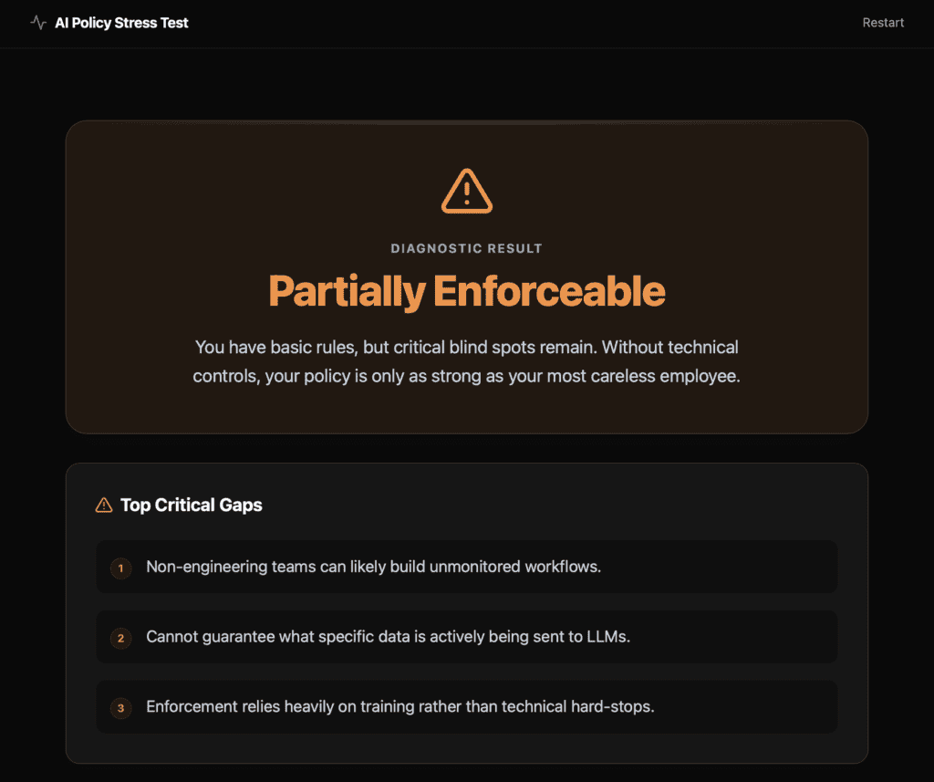 We built a Policy Stress Test to show exactly where yours breaks. If your policy assumes visibility you don’t have—you’ll see it in under 2 minutes.